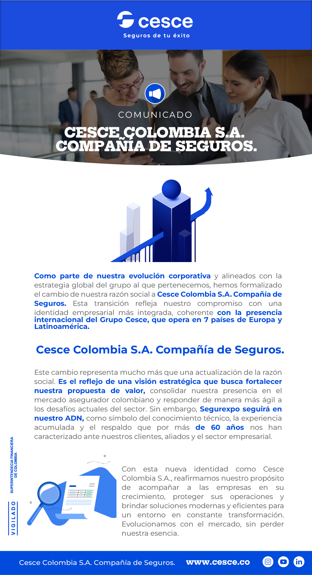 Cesce Colombia S.A. Compañía de Seguros. Este cambio representa mucho más que una actualización de la razón social. Es el reflejo de una visión estratégica que busca fortalecer nuestra propuesta de valor, consolidar nuestra presencia en el mercado asegurador colombiano y responder de manera más ágil a los desafíos actuales del sector. Sin embargo, Segurexpo seguirá en nuestro ADN, como símbolo del conocimiento técnico, la experiencia acumulada y el respaldo que por más de 60 años nos han caracterizado ante nuestros clientes, aliados y el sector empresarial.
