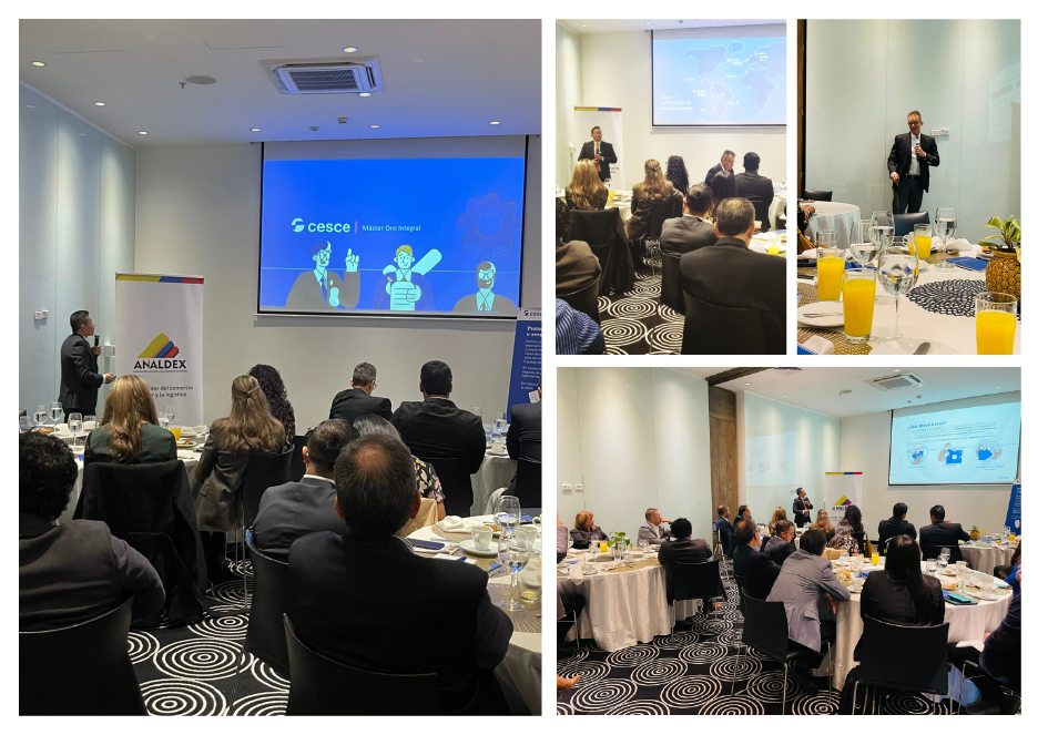 Durante el evento, Javier Diaz Molina, reconocido experto en comercio exterior, compartió su visión sobre las perspectivas económicas del mercado ante el cierre del año 2023 y la llegada del nuevo año. Por su parte, Edilberto Castañeda, Gerente Nacional Comercial de Cesce, presentó los servicios y ventajas que nuestra aseguradora ofrece para respaldar a las empresas colombianas en sus operaciones internacionales. Desde seguros de crédito hasta garantías y seguros de inversión en el exterior, Cesce proporciona soluciones personalizadas para minimizar los riesgos financieros y comerciales, promoviendo el crecimiento y la expansión de las empresas en el mercado global.